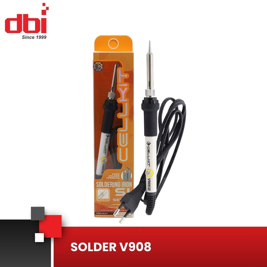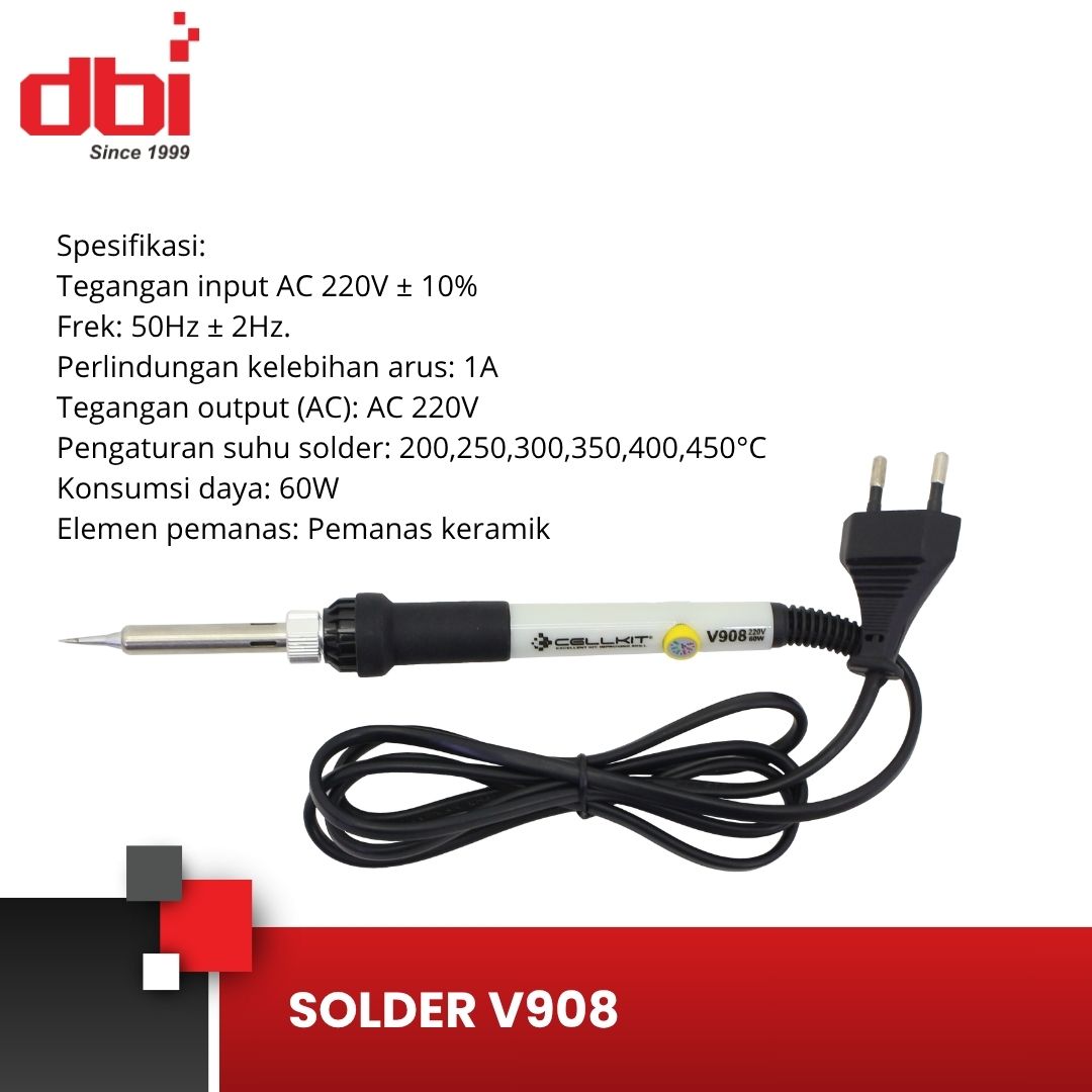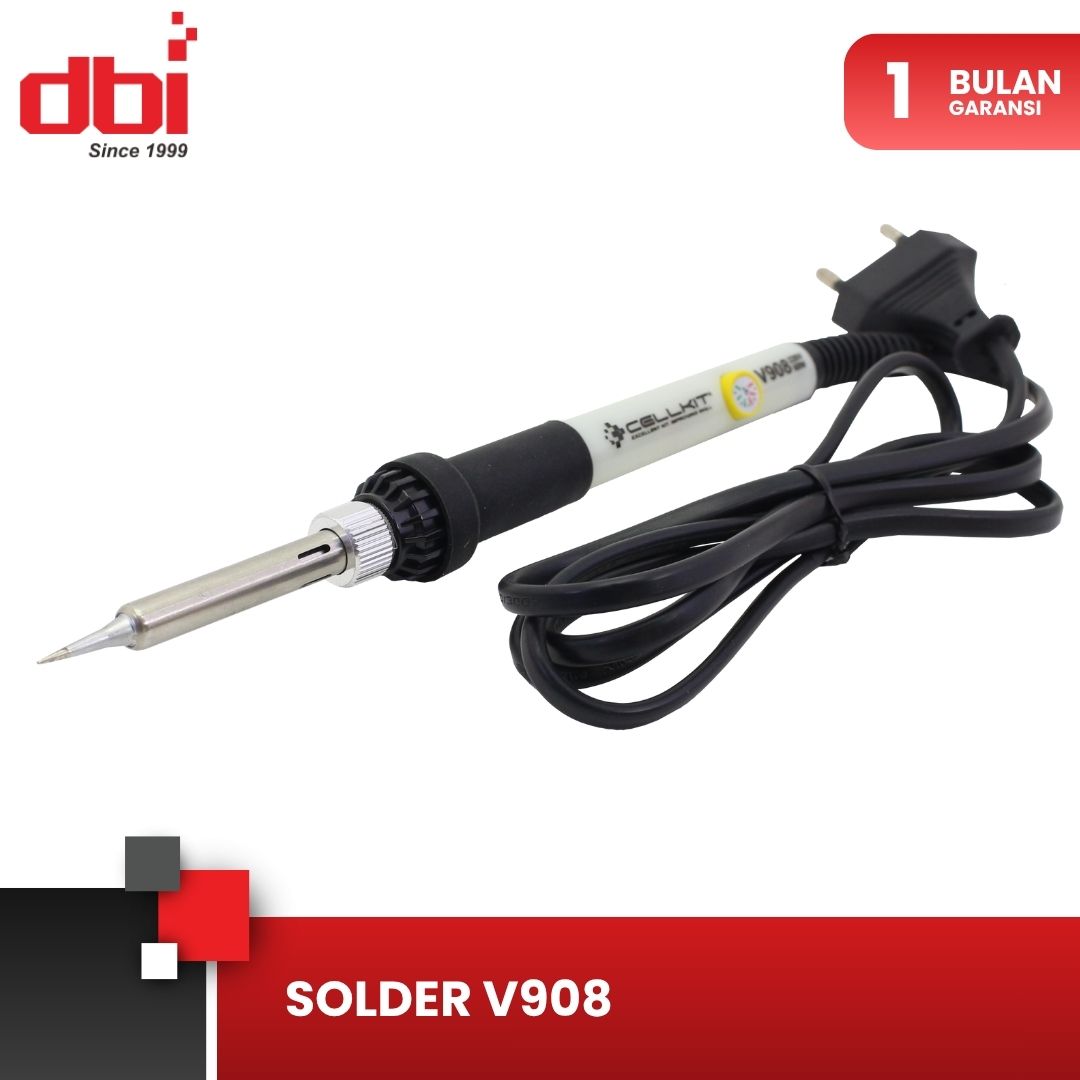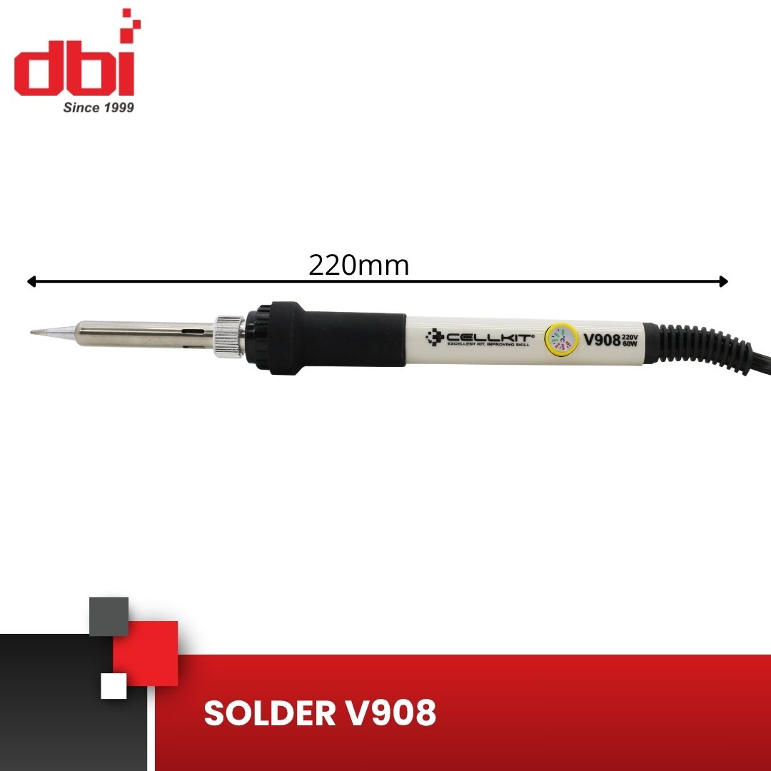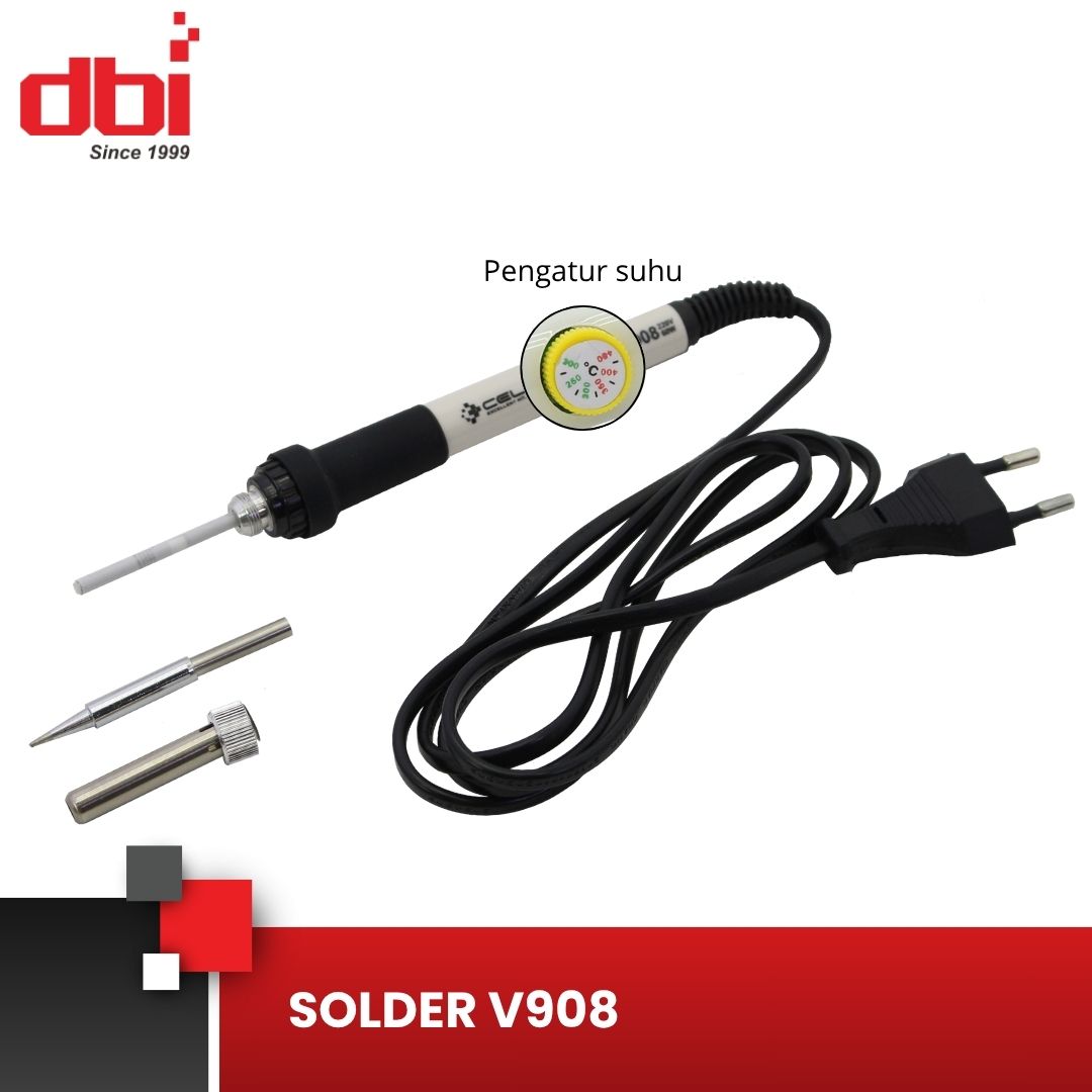 Solder praktis dengan suhu panas tinggi yang banyak digunakan oleh teknisi gadget seperti telepon genggam dan konsol game, saat memperbaiki IC kecil (SMD) atau suku cadang lainnya. Solder V908 dapat menggunakan mata solder seri 930/936 untuk operasi penyolderan, dapat digunakan untuk memperbaiki berbagai elektronik lain yang lebih besar.Dengan pengaturan suhu panas pada gagang, suhu yang diinginkan dapat dicapai lebih cepat dengan menyesuaikan sesuai kebutuhan. Mata solder terbuat dari logam agar lebih mudah dibersihkan dan diganti. Ini harus dimiliki solder untuk teknisi gadget, juga banyak digunakan untuk mendukung hobi elektronik, pendidikan dan lain-lain, harus dimiliki oleh teknisi muda.
